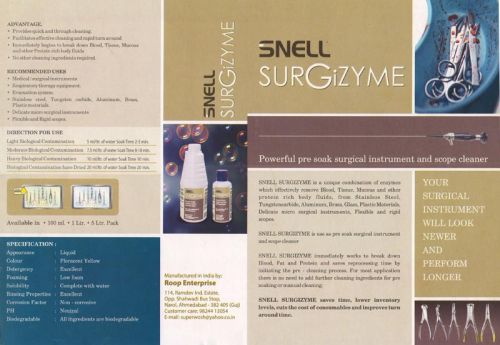 Contact SupplierWe offer Powerful pre Surgical Instrument Cleaner to the customers. Snell Surgizyme is a unique combination of enzymes which effectively remove blood, tissue, mucous and other protein rich body fluids, from stainless steel, tungstencarbide, aluminum, brass, glass, plastic materials, delicate micro surgical instruments, flexible and rigid scopes.