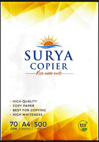 Surya Copier A4 Paper is a high-quality multipurpose paper designed for smooth printing and copying needs. Manufactured with premium-grade pulp, it ensures clear, sharp, and vibrant prints. Its uniform thickness and bright white surface provide excellent performance for both office and personal use.