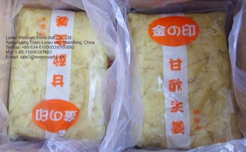 Product Origin: Laiwu city, Shandong Province, China Brand Name: WENYUAN Thickness: 0.8-1mm Color: pink, white Flavor: sweet and sour Pack: (0.5-1kg)*10pkt/ctn,(20lbs-10kg)/pail Cert: HACCP, HALAL, KOSHER, QS, FDA Shelf life: 18-24months Temperature: +5 - +25°С Preservation process: brine Ingredients: ginger, water, salt, vinegar, potassium sorbate, aspartame. Price Terms: TT/LC at sight Supply Ability: