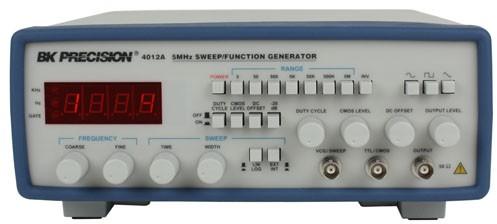 BK Precision 4012A 5 MHz Sweep Function Generator 0.5 Hz to 5 MHz Sine, Square, Triangle, Pulse, & Ramp output Coarse and Fine tuning 4 digit LED display Linear and log sweep Variable duty cycle Variable DC offset Variable amplitude output plus 20dB attenuator 20Vpp output into open circuit (10Vpp into 50 Ωs) MHz