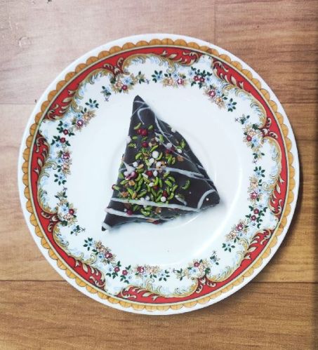 Mouth watering delicious yumfillz chocopaan made with chocolate coating on green paan and garnished by different food items.
