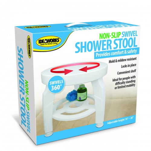 SWIVEL SHOWER STOOL The ultimate shower stool. Get in and out of the tub with ease. Rotates 360 degrees for full freedom of movement inside your tub or shower. Wash and rinse your entire body without standing. Compact size is perfect for smaller spaces. Supports up to 4 ID JB5596 BRAND IDW-HNH CASE PACK 2 CASE WEIGHT 21.6 CASE LENGTH 18.5 CASE WIDTH 13.4 CONSUMER PACK 4 COLOR BOX CONSUMER PACK DIMENSIONS 17.795" X 16.337" X 6.02" UPC EAN NUMBER 017874002450