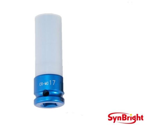 We are offering synbright 1/2" 6pt 17 mm thin wall socket. 1/2" 6pt 17 mm thin wall socket 1. Spec: 1/2" 6pt 17 mm 2. Material: cr-mo 3. Color: blue (yellow/red) 4. Weight: 200 g 5. Length: 85 mm 1. Thin-wall torque socket especially made for alloy-wheels. 2. Protective sleeves to avoid scratch the rim.