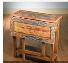 "Extreme distressed multi-colored painted finish. Drop down hinged leaf has leg that swings out to support. Two small drawers, one at each end."