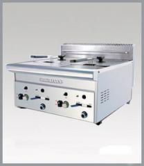 Gas fryer.  . table top double pot. . cap: 6+6 ltr. . temp: 60 ~ 190 °C . pot dim: 240*300*150 mm. . basket dim: 185*240*140 mm. . power: 220-240 v / 50-60 hz / 3.25+3.25 kw. . weight: 10.5 kg. . dimension: 600*600*340 mm.
