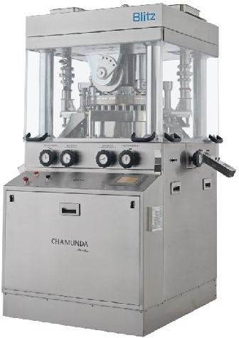This central driven double rotary tablet press stands out because of its new aesthetic and ergonomically improved design that is benefited with higher turret speed, powerful pre compression force upto 5 Ton. And main compression force upto 10 Ton.Reliable and easy to operate Blitz is fitted with Hydro-Pneumatic power pack for overload pressure release system to prevent damage to tooling and numerous alluring features like auto lubrication for centralized lubrication, central driven and easy to access front controls.