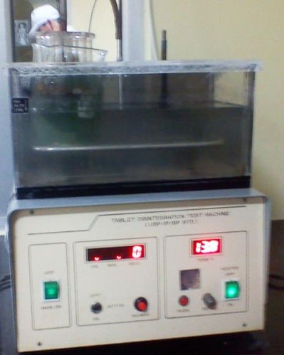 Contact SupplierWe provide a premium quality Tablet Disintegration Test Machine to our clients. The Tablet Disintegration Test Machine, we manufacture, is a test equipment work on UP and DOWN movement of Tablet in Medium of water kept 37 degree C. Our Tablet Disintegration Test Machine is built on a steel cabinet, which housed a geared motor for the vertical shaft drive the shaft moves up and down. On the upper end of the shaft fitted a horizontal strip with clamp on either side. These clamps hold glass vessels open at both ends and with stainless steel wire gauge with rubber rings at the lower end, which dips in water.