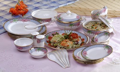 Bone China Dinner Set 36 Pcs. Shape : President. Design No. 909 Range : DGCH. Reach Dinner Set : Qtr. Plates 6 Nos, Full Plate 6 Nos, Soup Bowls 6 Nos, Serving Bowl 6 Nos, Spoons 6 Nos, Donga with Lid 2 Nos, Salt & Paper 2 Nos.