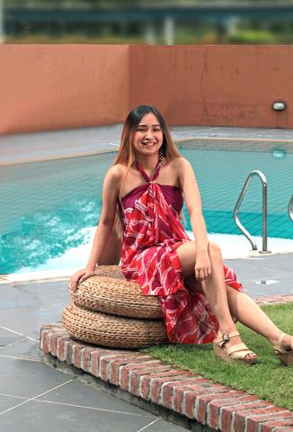 The beautiful and unique 'Saloma Sarong Shawl' is the most flexible item you could pack for any holiday. Its versatility lies in the gold ring which allows you to tie in many different ways. As its suggests, your Sarong Shawl is more than just beach wear. Not only it is an elegant and functional garment to wear over your swimming costume, it can be worn as a travel scarf, an evening shawl, a skirt or an elegant sleeveless cardigan.