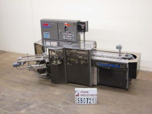 Semi automatic continuous motion vertical cartoner rated to 180 CPM. Equipped with 3-34" centers with a carton size range of: (length) 34" – 2-12"; (width) 34" – 2"; (depth) xx – 8". Equipped with AB PLC, four head rotary carton feeder and Lexan guarding. Mounted on casters.