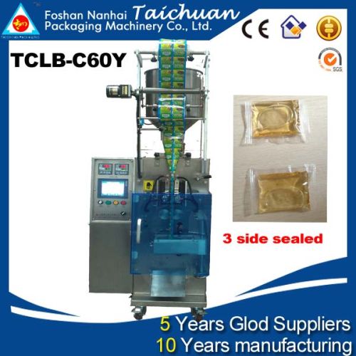 Contact Supplierwe are offering tclb-c60y small scale automatic vertical honey packing machine. Applications solid material which shape is roll, grain or slice. Such as puffed food, shrimp slice, peanuts, popcorn, chocolate, seeds, oatmeal, coffee, white sugar, electuary and solid beverage etc. Descriptions 1. High precision, high efficiency without crash the materials. 2.full automaticity. The machine complete the whole procedure of feeding, measuring, bagging, date printing, charging, product out put automatically. 3.high sensitivity photoelectric eye color tracing, numerical input of cutting sealing position for extra accuracy. Specifications type tclb-320b film width 320mm packing material oppcpp,oppce,petpe film roll diameter max.300 mm packing speed 30-100 bagsmin bag size (l)30-200 mm (w)50-150 mm measuring range 50-500ml power 220v,50hz,2kva machine size (l)900×(w)680×(h)1960 machine weight 300kg