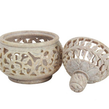 The dimensions of the round tealight holder are - Diameter - 7.5 cm Height - 7.5 cm Handmade using Indian soapstone, which is harder than average soapstone and has been used in India over centuries.....