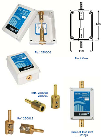 DESCRIPTION : • Wall mounted grounding test joint, consisting of Cu/Zn alloy (brass) manual disconnection system    and 160x118x75 mm PVC box, water resistant (IP 65). Stainless steel hardware. • Specially made for 50 mm² cross section Cu cable down conductors.• Fittings also available for connection of 70 and 95 mm² cross section cables and for copper tape   30x2 mm down conductors.• Complies with the requirements set forth in the standards:      • UNE 21.186    • NFC 17.102     • EN 50.164/1   • EN