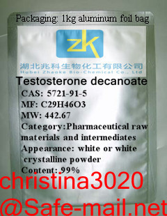 We offer Testosterone decanoate. CAS: 5721-91-5 MF: C29H46O3 MW: 442.67 Category:Pharmaceutical raw materials and intermediates Appearance: white or white crystalline powder Content: 99% Packaging: 1kg aluminum foil bag Please send me email if you are interested in our products or have any question. I am so happy to help you.