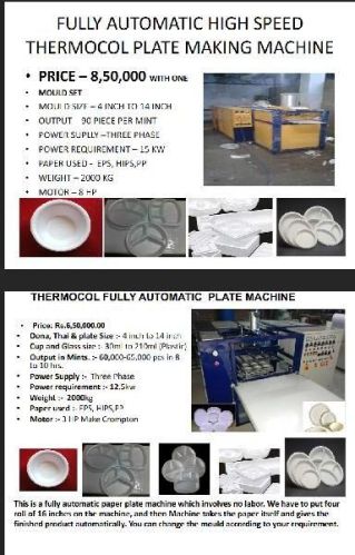 Dona, Thai & plate Size :- 4 inch to 14 inch Cup and Glass size :- 40ml to 80ml (Plastic) Output :- 60,000 to 65,000 pcs in 8 to 10 hrs. Power Supply :- Three Phase Power requirement :- 32 kw Weight :- 2000 kg approx.. Paper used :- EPS, HIPS,PP Motor :- 3 HP Make Crompton