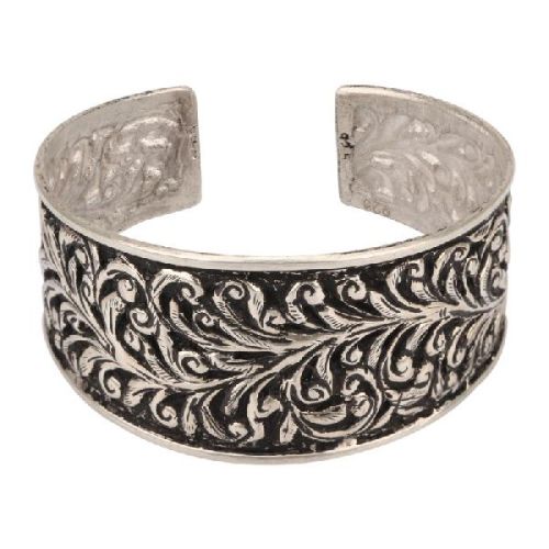 Set in 92.5 Sterling Silver, this thick cuff has intricate hand-worked foliate engraving along the cuff. An exquisite, adjustable piece that can be paired with another statement piece or worn as is!