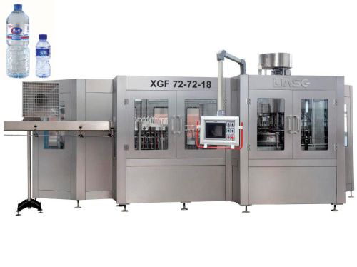 xgf machine, an integration of washer, filler and sealer, including three functions into one, is used for production of polyester bottles and other containers filled with uncarbonated beverage like mineral water, purified water, fruit juice and liquor, etc.
