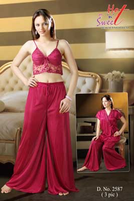 We are engaged in offering Three Piece Nighty for the clients. Designed by expert designers using soft satin material along with colorful lace work, our Three Piece Nighties are high on demand in the global markets. We provide Three Piece Nighty at very affordable prices for the clients. Why Our Three Piece Nighty ? Soft fabricMarvelous looksComfortable to the wearerColor fastAlluring designs Specifications : Size : Free sizeColors : 6 colorsPrice : Rs.
