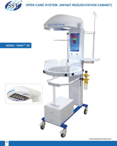 The open care system combines virtually all the technology a caregiver may need in situation needed for resuscitation. The neonate can be supplied with a constant oxygen flow through the oxygen humidifier when connected to an oxygen cylinder/wall unit. The motorized slow suction can be used with a simple flip of a switch. A digital apgar time is standard, which signals when 1, 5 and 10 minutes have elapsed.