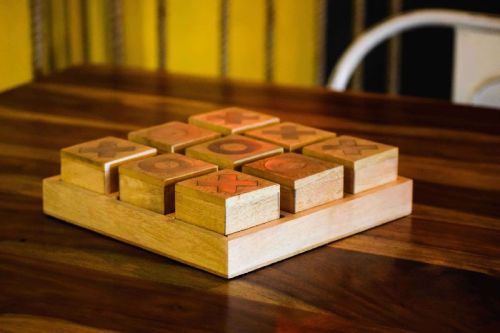 Contact SupplierSetting in the nostalgia of childhood, you can’t miss this one. This is a two in one wooden board games set consisting of tic tac toe and solitaire. It comes in an elegant square shaped box. Interestingly, one side of the open top lid functions as tic tac board and the other side functions as a solitaire board. The beautiful wooden pieces for tic tac toe and steel marbles for solitaire are kept in two separate pouches placed in the two compartments inside the box. The twin game set is made with good quality sesame wood and is handcrafted by the artisans of north India. Isn’t Indian craft gifting us a box of happiness with this one?