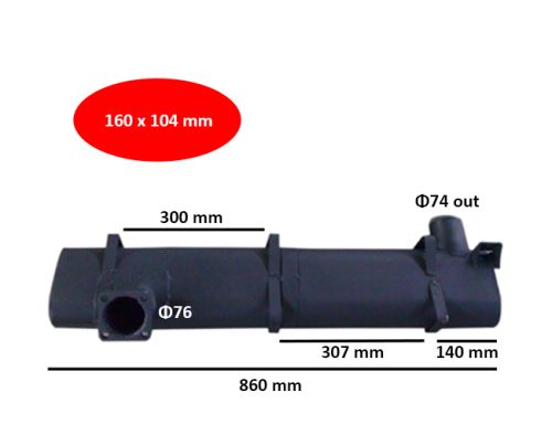 Tractor Exhaust RENAULT 106.14, 113.14 Silencer 160 x 104 mm Length 860 mm Pipe in D76 mm Square Flange 90*90 mm Pipe out D74 mm out