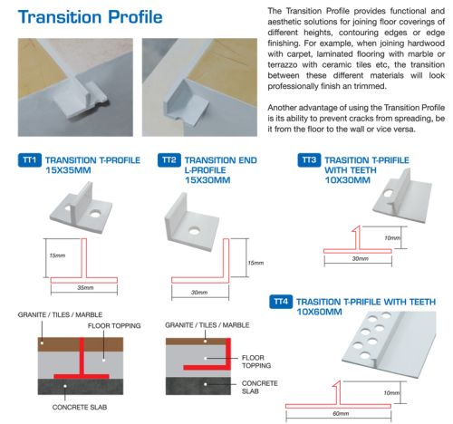 The Transition Profile provides functional and aesthetic solutions for joining floor coverings of different heights, contouring edges or edge finishing. For example, when joining hardwood with carpet, lanminated flooring with marble or terrazzo with ceramic tiles etc, the transition between these different materials will look professionally finished and trimmied. Another advantage of using the Transition Profile is its ability to prevent cracks from spreading, be it from the floor to the wall or vice versa.