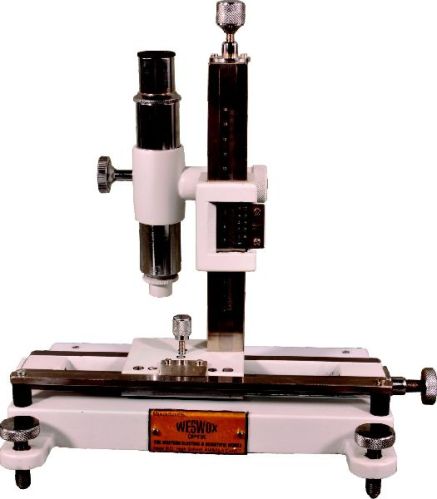 • focusing of microscope tube by rack and pinion and microscope consisting of 10x eyepiece ramsden with fine glass graticule.Â