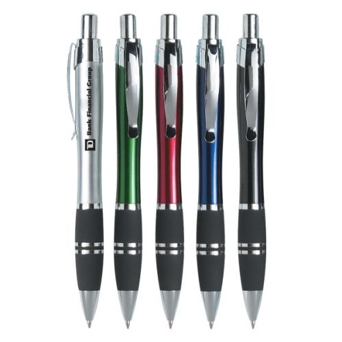 Tri-band ballpoint pen with silver trim and black rubber grip for writing comfort and control. Plunger action. Available in a variety of new colors! A great giveaway for any event or trade show. Ensure your clients remember you and write away the competition with these great pens!