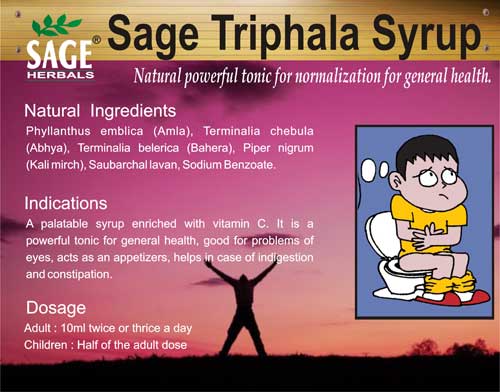 Contact SupplierWe are offering triphala syrup. sage triphala syrup is useful in relieving habitual constipation. Sage triphala syrup builds up body resistance; gives relief in dyspepsia and constipation and is good for problems of eyes. Sage triphala syrup is enriched with vitamin c, a vitamin that is widely known as an immunity booster. natural ingredients