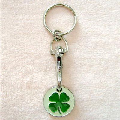 Promotional metal trolley coin keychain with debossed four-leaf clover design on the coin. This makes an ideal and nice-looking keychain for cart use. Material : zinc alloy die cast color : any customized colors: green, blue or red coin size : 24.5mm dia., 2mm thickness packaging : individually polybagged, 500pcsctn