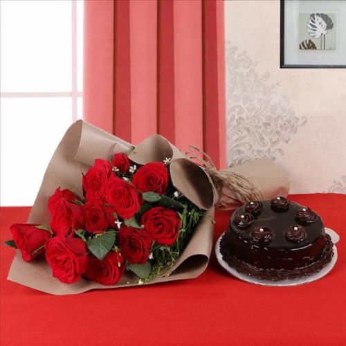 Roses are known to spell love in a beautiful manner. Send this Bouquet of 12 Red Roses, wrapped in Brown paper to make someone feel loved. Make this complete with a Half Kg Truffle Cake.Product Contains:- 12 Red Roses- Brown Paper- Truffle Cake (Half Kg)