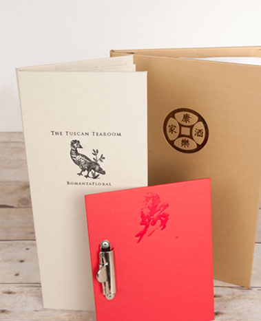 TURNED EDGE MENU COVERS This is the choice for elegance and sophistication. Each piece is custom made to your specifications. A hard cover menu wrapped with high quality simulated leather and book cloth materials. Picture style corner or bands hold individual menu cover inserts. Add even more customization with a foil stamped or screen printed logo.