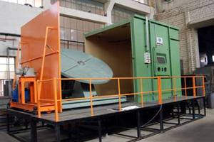 The mold is clamped in horizontal position on the turn table using centering plates & four heavy duty T-slot clamps. The turn table is tilted hydraulically at suitable angle. The work car with turntable and mold is driven inside the cabinet. The turn table is rotated through electric motor with gear box arrangement. A spring is provided for holding the gun arrangement to avoid fatigue of operator. The abrasive is pressurized in a pressure vessel by compressed air and then forced through the nozzle to blast clean the trye mold.