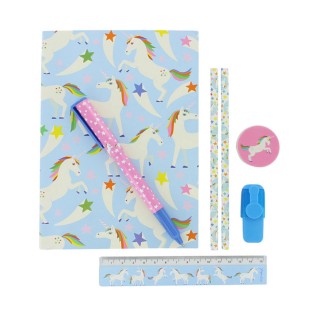 Start your stationery collection afresh with this adorable set featuring a cute unicorn print. It contains all the essentials you need to be super organised at home or school with a ball pen, 2 pencils, a rubber, a ruler, a highlighter and an exercise book. Perfect for the start of a new school term or a coordinated look to your desk. Supplied in a zip-lock wallet, measures (approx)