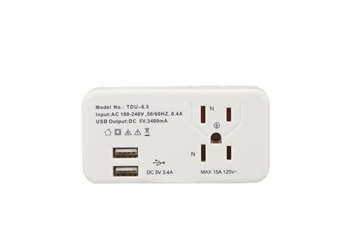 1.2P+(2P+E) combined receptacle, 2.Double USB quick charge  3.Double USB Output 3.4A, 4.Fireproof materials, 5.Side socket, 6.Grounding terminal design