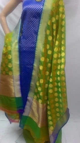 Affordable price and high quality are the major attributes owing to which our Banarasi Silk Hand Woven Salwar Kame is highly in demand amongst buyers. Catering to the voluminous and urgent requirements of our clients from Mumbai(India); count on us to avail the same. These Unstitched Banarasi Hand Woven Suits have a distinct zari work dupatta with a brocade kameez and a matching