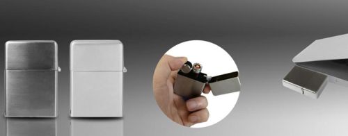 We provide USB lighter. Meterial:zinc alloy Finish:spray paint Battery: Lithium battery, with 15second self-extinguish and with memory function SIZE:56.37x49.37x14mm Charging indicator, when charging light is red, when fully charged light is green ( Extra cost base on different memory