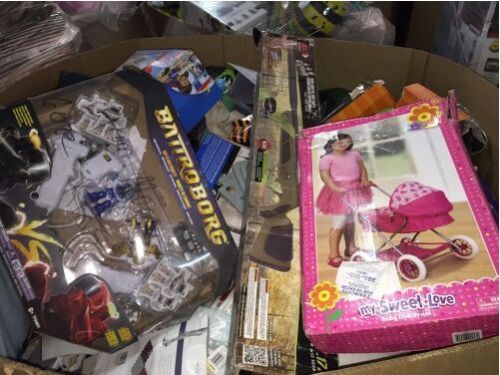 Toy containers. Includes returned items and liquidation items. Container includes but is not limited to brands like; Fisher Price; Hasbro; Bandai; Lego; Vtech; Adventure Wheels; Disney; Radio Flyer;; Mattel; Milton Bradley and more. Some items may contain return tags and stickers. Mixes change periodically. We do our best to update pictures but please contact us for the most up to date mix. Pictures are just for illustration purposes. For price and availability, please contact us. Size Availability : 1000 >