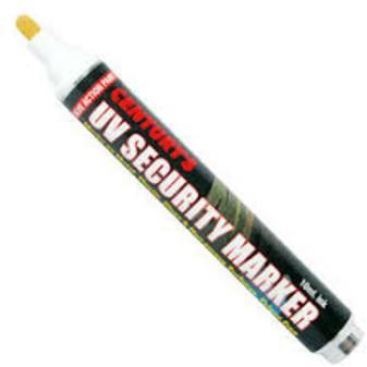 Contact SupplierCentury's uv security marker is a feltip paint marker with applications in wide range of industries including hospitality industry, hotel industry, manufacturing , security etc. Its marking are only visible in black light or 'uv light'. It is used in hotels & hospitals for quality and security markings. It is also used in manufacturing units, automobile industry, repair workshops, laundry, clubs, army etc. The markings made by the marker are permanent & weather-proof. It works on all porous & non-porous surfaces including metal, plastic, glass, ceramic, rubber and stone. The ink is xylene free. The marker is very popular in europe & america and widely used across all kind of sectors. century inks is the only company to manufacture & supply this marker in india. The price for the marker is inr 299. For bulk quantities, contact us via email, phone or fax. Colour available in greenish yellow.