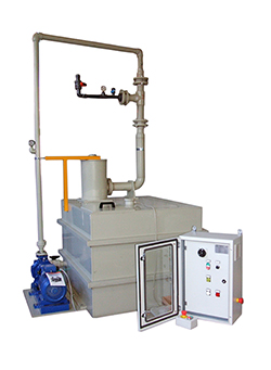 the vacuum generating system based on the Venturi principle ejector system through high-performance, consisting of the liquid containment tank, centrifugal high-pressure pump.The high pressure fluid circuit is controlled by analog gauge, while on the vacuum circuit is installed on a dedicated vacuum gauge and manual regulation of the vacuum valve.The tank is equipped with level sensor and temperature control.