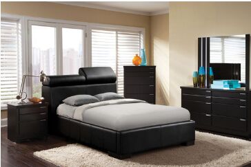 VALENCIA BLACK 111200 Modern design platform bed with 13 slats, chrome legs, a large upholstered headboard and adjustable headrests. No box springs required. Item Dimensions (LWH) Queen Headboard 65 x 44 x 6 King Headboard 81 x 44 x