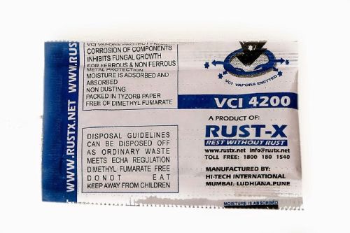 Contact Supplier| PRODUCT DESCRIPTION Rust-X® VCI Emitter 4200 emitters are unique devices designed to provide corrosion protection for metal components and parts enclosed in non-ventilated control boxes, cabinets or tool boxes up to 5 cubic feet in volume. The VCI (Volatile Corrosion Inhibitor) emits vapors that absorb as molecular layers on metal surfaces to protect critical, complex and expensive electronic equipment and other metal components during operation, shipping or storage. VCI Emitter 4200 is a small, emitter with a breathable synthetic pouch membrane through which the corrosion inhibitor is released. It provides long-term protection against corrosion even in the presence of adverse conditions including salt, moisture, airborne contaminants, H2S, SO2, NH3 and others. | ||