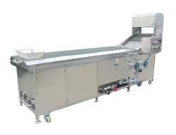Vegetable washer processing machine is dumped into the washer where an air blower attached to the unit will agitate it and subsequently wash it by a strong water spray. The product will be subject to four stages of washing. Soaking into the water. Agitation in the water. Subjecting to strong fresh water spray. Draining after washing.