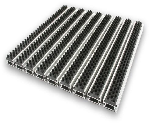 Robust, high quality aluminium system for heavy duty use.Profile made using 30% recycled aluminium. Flexible, yet durable PVC linking joints for ease of handling/fitting. Four surface options available – 20mm strip inserts of either carpet, rubber or brushes.Choose from one, or a combination of, surface options. Competitively priced to comparative fitted systems.Slip tested to BS 7976-2:2002 Pendulum Test.Fire tested to: Cfl-S1.