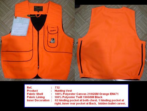 We are offering vest product : hunting vest. Fabric shell : 100% polyester canvas 210 gsm, orange en 471. Fabric lining : 100% polyester twill 190gsm.black inner decoration : 2 hiding pocket at both chest.1 hiding pocket at right, inner rear pocket at back. Hidden bullet career