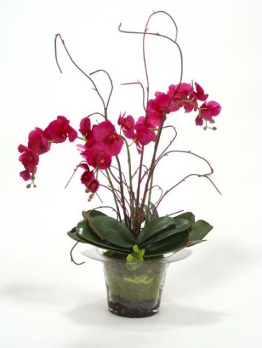 7523# - Violet Orchid w Kiwi Vines, Birch Twigs and Preserved Orchid Bark in Glass Planter Container Material Glass Dimensions Height" x Width" x Depth" 36 x 28 x 25 Dominant Color Violet Dominant Color Family Purples Shipping Weight 7 Ships
