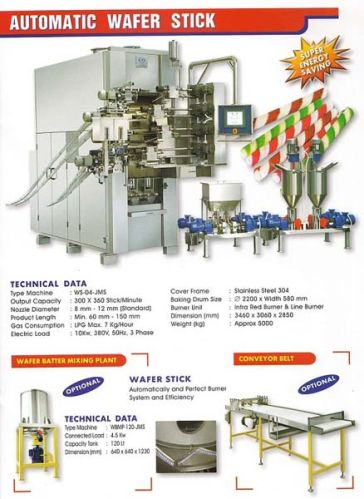 We are offering wafer roll machine. This opportunities we would like to introducing our company as food processing machinery in indonesia . Since 1991 , we experience to producing some machine of wafer and chocolate . Please don't hesitate to contact me , if you are interesting in : - wafer flat machine - wafer stick 2 line and 4 lines - egg roll machine - enrober and cooling tunnel - ball mill and turbo mixer