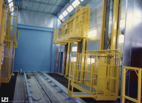 The product moves through the area on a conveyor system and is always staged in the same spot for painting. The workers are able to reach out and paint from the side to the center of the product. This elevated lift utilizes explosion proof electronic motors, with pneumatic signal switches, interlocked to the customer's conveyor system for safety and ergonomic positioning.