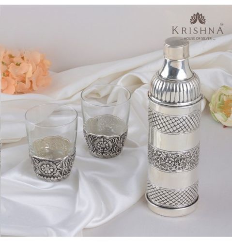 This Silver Bottle is intricately crafted in 92.5 Silver, paired with a set of Silver glasses with floral motif.