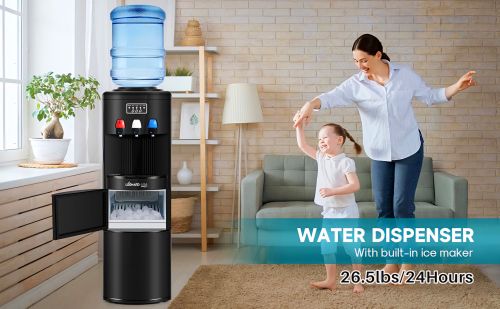 Packaging DetailsWater Dispenser with Ice Maker, 2 in 1 Water Dispense with Built-in Ice Maker, Water Cooler Dispenser for 3-5 Gallon Bottle with a Scoop, Ice-Making Chamber, Child Safety Lock, Black 35.6 x 31.2 x 101.6 Centimeters